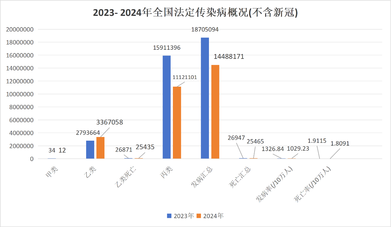 2025.12.09,国家疾病预防控制局监测预警司发布了2024年全国法定传染病疫情概况,全国(不含港澳台地区,下同)共报告法定传染病14488171例(不含新冠),相比2023年(不含新冠)下降了22.5%;死亡25465人,相比2023年下降了5.5%;报告发病率1029.23/10万人,报告死亡率1.8091/10万人,如下图1和表一所示。