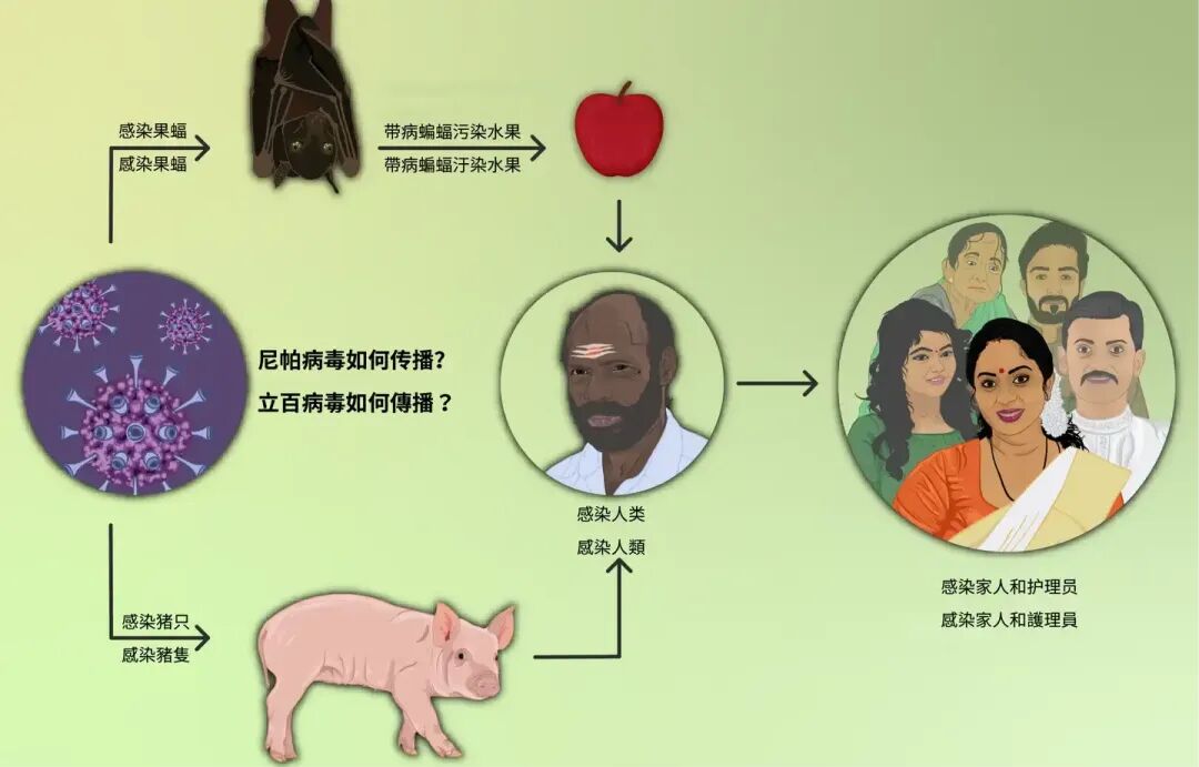 感染后不出现明显症状的狐蝠科果蝠是NiV的天然宿主。研究亦表明,NiV的地理分布与狐蝠科的地理分布重叠,如猪、马、山羊、绵羊、猫和狗等家养动物也是NiV自然宿主,其感染后具有传染性,其中猪是NiV主要传染源,其他自然宿主还有猎犬及鼠类等。在疫情中也多次出现了人传人现象,患者及感染者也是重要的传染源。