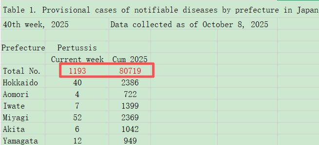 近日,据日本卫生安全研究所(JIHS)最新公布数据,截至2025.10.08第40周,日本今年一共报告了80719例百日咳病例(图1),是去年全年(4095例)的近20倍,创下了自2018年启用现行统计方法以来的最高纪录(图2)。今年8月日本厚生劳动省曾表示,目前仍不清楚今年该国百日咳如此高发的原因,提醒民众加强防范措施,例如接种疫苗和戴口罩等。