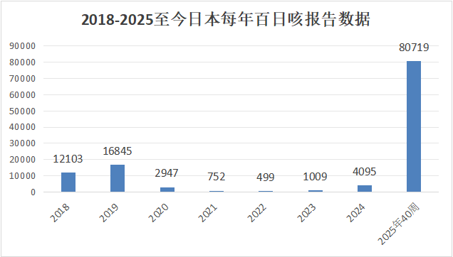图2. 2018-2025至今日本每年百日咳报告数据(来源JIHS、WHO)
