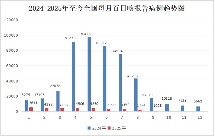 图4. 2024-2025年全国每月百日咳报告病例数(来源中疾控)