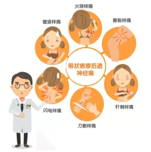 皮疹只是带状疱疹的一个临床表现,神经痛是带状疱疹另外一个特征性表现。疼痛的性质多为跳痛、浅表性刺痛、烧灼感,伴有皮肤痛觉过敏和/或痛觉异常,疼痛可与疱疹同时或早于疱疹出现。如果疼痛在疱疹消失后仍然存在,持续时间超过一个月,就成为带状疱疹后遗神经痛。有一部分患者的神经痛在疱疹好后仍可持续几个月、几年甚至几十年…..剧烈且漫长的带状疱疹后神经痛,成为患者最大的梦魇。