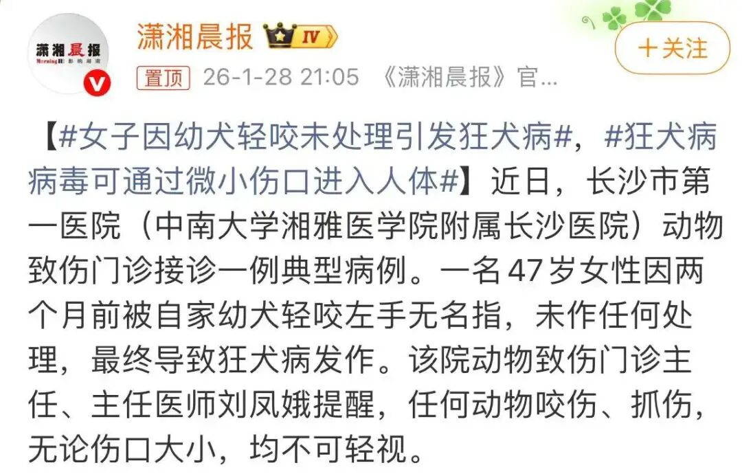近日,长沙市第一医院(中南大学湘雅医学院附属长沙医院)动物致伤门诊接诊一例典型病例:一位47岁女性因两个月前被自家幼犬轻咬左手无名指,未作任何处理,最终导致狂犬病发作。尽管立即送医,病情仍迅速恶化,最终抢救无效死亡。